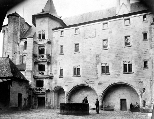 En 1364, Charles V accède au trône ; son règne marque le point de départ d’une période longue d’une quarantaine d’années durant laquelle les principaux membres de la famille royale vont dépenser sans compter pour se faire édifier de somptueuses résidences palatiales. En 1356, Louis Ier, frère cadet de Charles V, reçoit de son père Jean le Bon le comté d’Anjou, érigé en duché et transformé en apanage quatre ans plus tard. À Saumur, deuxième ville par la taille après la capitale Angers, il trouve un château idéalement placé au sommet d’un promontoire dominant l’agglomération ainsi que le pont permettant de traverser la Loire, mais dont le traitement architectural ne répond pas à ses ambitions. Des considérations défensives — la guerre de Cent ans touche alors durement l’Anjou — mais surtout le besoin de traduire dans la pierre son envergure politique, amènent le duc d’Anjou à engager un ambitieux programme de reconstruction ; à partir de 1368, il fait déraser l’austère forteresse et s’en sert de socle pour édifier un château-palais combinant à la fois un solide dispositif défensif et un programme résidentiel exceptionnel (fig. 1).