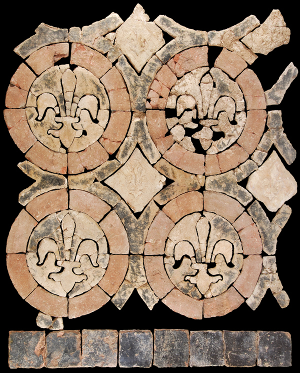 Fig. 8 : Carreaux de pavements mis au jour en 1907 par l’architecte L. Magne dans la chambre de retrait. Cliché Ch. Petiteau/Montevideo., Château-musée de Saumur.