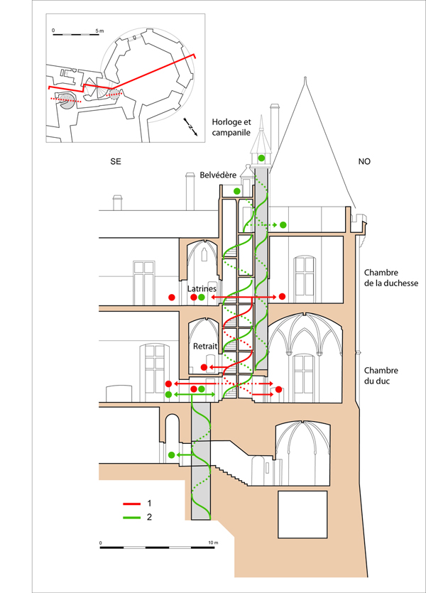 L’agencement de l’ensemble témoigne de l’habileté du maître d’œuvre qui a su loger dans un espace réduit pas moins de 4 escaliers en vis. Le principal d’entre eux, à double révolution, permet deux circulations parallèles, une pour les parties réservées au couple ducal dont les chambres superposées dans la tour sont accompagnées d’un retrait et de latrines, l’autre dédiée aux circulations de service. Dans ce plan complexe s’insèrent encore plusieurs conduits de cheminée, des couloirs et le conduit des poids de l’horloge située sous le campanile dont le petit toit domine l’ensemble du château.