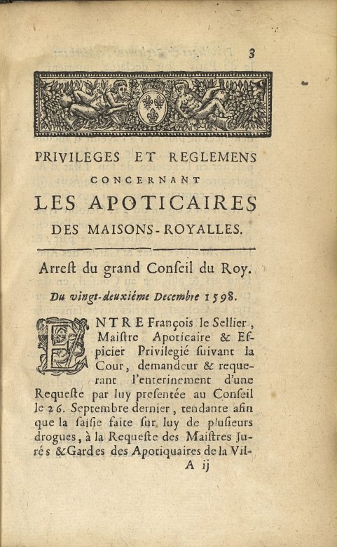 Accueil / Histoire et fonction / Maisons, services et charges / Etudes modernes / Privileges et Reglemens concernant les Apoticaires des Maisons Royalles