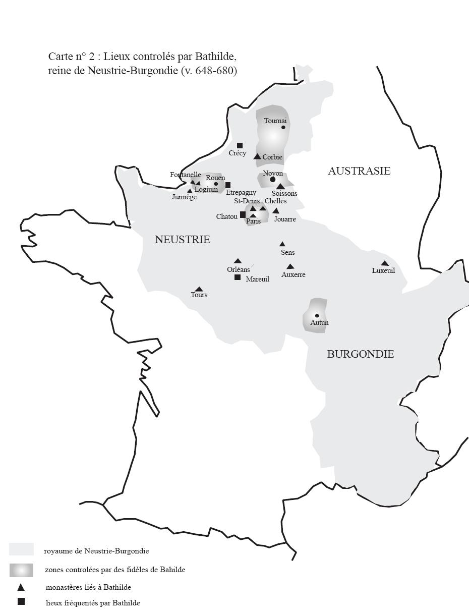 Si les premières reines mérovingiennes s’appuient sur un certain nombre de communautés religieuses pour asseoir leur pouvoir territorial, Bathilde associe de manière beaucoup plus systématique les monastères qui deviennent, d’une manière générale au VIIe siècle, des éléments essentiels de pouvoir. Selon la vita Bathildis, la reine aurait fondé le monastère féminin de Chelles dans le Parisis, ainsi que le monastère masculin de Corbie dans la paroisse d’Amiens [108]. Elle aurait par ailleurs donnée une grande étendue forestière issue du fisc et d’autres biens à Philibert qui y édifie le monastère de Jumièges [109]. Elle aurait fait en outre de larges donations aux monastères de Corbion, de Fontanelles, de Logium, de Luxeuil, ainsi qu’aux autres monastères de Burgondie, de même qu’à Jouarre, à Faremoutiers et aux basiliques et monastères de la ville de Paris [110]. Enfin, elle aurait confirmé les privilèges et concédé des immunités à Saint-Denis, Saint-Germain, Saint-Médard, Saint-Pierre, Saint-Aignan, Saint-Martin et à tous les autres de sa connaissance [111]. Ces derniers monastères ont été identifiés avec Saint-Denis au nord de Paris, Saint-Germain d’Auxerre, Saint-Médard de Soissons, Saint-Pierre (-le-Vif) de Sens, Saint-Aignan d’Orléans et Saint-Martin de Tours [112]. Or les dispositions prises par Bathilde en faveur de ces seniores basilicae [113] permettent l’émancipation des communautés de la tutelle épiscopale (ce qui a valu à la reine l’opposition de certains évêques [114]) et de les placer sous la protection royale : il en résulte des liens plus étroits entre royauté et monastères, confirmés par les privilèges accordés par les évêques concernés qui nous sont parvenus [115]. La politique de la reine est présentée, par la vita, d’un point de vue religieux : les frères qui font partie ces communautés doivent vivre en conformité avec la règle et prier pour le roi et la paix [116]. Sans remettre en cause sa facette spirituelle, elle a cependant aussi des implications politiques qui n’ont probablement pas échappé à Bathilde. La sélection des basiliques ne relève pas du hasard. La chronique de Frédégaire rapporte qu’en 626, Godin, qui a encouru la colère de Clotaire II, est condamné par celui-ci à faire le tour des principaux lieux saints, où il devait renouveler son serment de lui être fidèle : Saint-Médard de Soissons, Saint-Denis de Paris, Saint-Aignan d’Orléans, Saint-Martin de Tours [117]. La similitude des deux listes est
