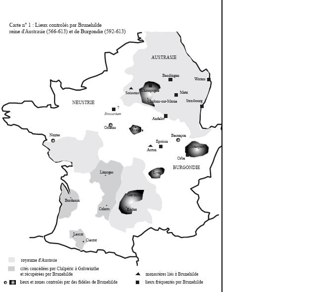 La superposition des cartes localisant les déplacements des reines, les zones contrôlées par leurs fidèles et les monastères auxquelles elles sont liées montrent, dans les cas de Brunehilde et de Bathilde (pour lesquelles on a le plus de renseignements), que celles-ci se sont attachées à inscrire leur autorité dans l’espace d’une manière ou d’une autre. Ces lieux relais de l’autorité royale à l’échelon local, connus par le hasard des sources et donc probablement plus nombreux dans la réalité, produisent un maillage du territoire qu’il est difficile de penser inconscient. Si les reines, comme les rois, sont conscientes de l’étendue du royaume et s’attachent à en assurer le contrôle, elles en perçoivent aussi, même si c’est moins nettement, les limites.
