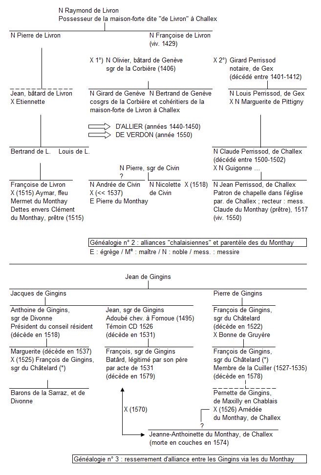 Ce même Pierre Dumonthay épouse, à une date indéterminée, noble Andrée de Civin (veuve en 1537), issue d’un ancien lignage faucignerand, originaire de la paroisse de Pers-Jussy (Haute-Savoie) [65]. Comme dans le cas probable d’Amédée Dumonthay, vis à vis de François de Gingins, des dettes des Civin à l’égard de Pierre Dumonthay sont peut-être à l’origine de cette alliance dans la noblesse, mais plus certainement aussi des liens complexes de solidarité entretenus et réitérés au cours des générations successives entre plusieurs lignages et familles (généalogie n° 2). Ce mariage l’apparente en effet aux nobles Perrissod, de la branche de Challex,