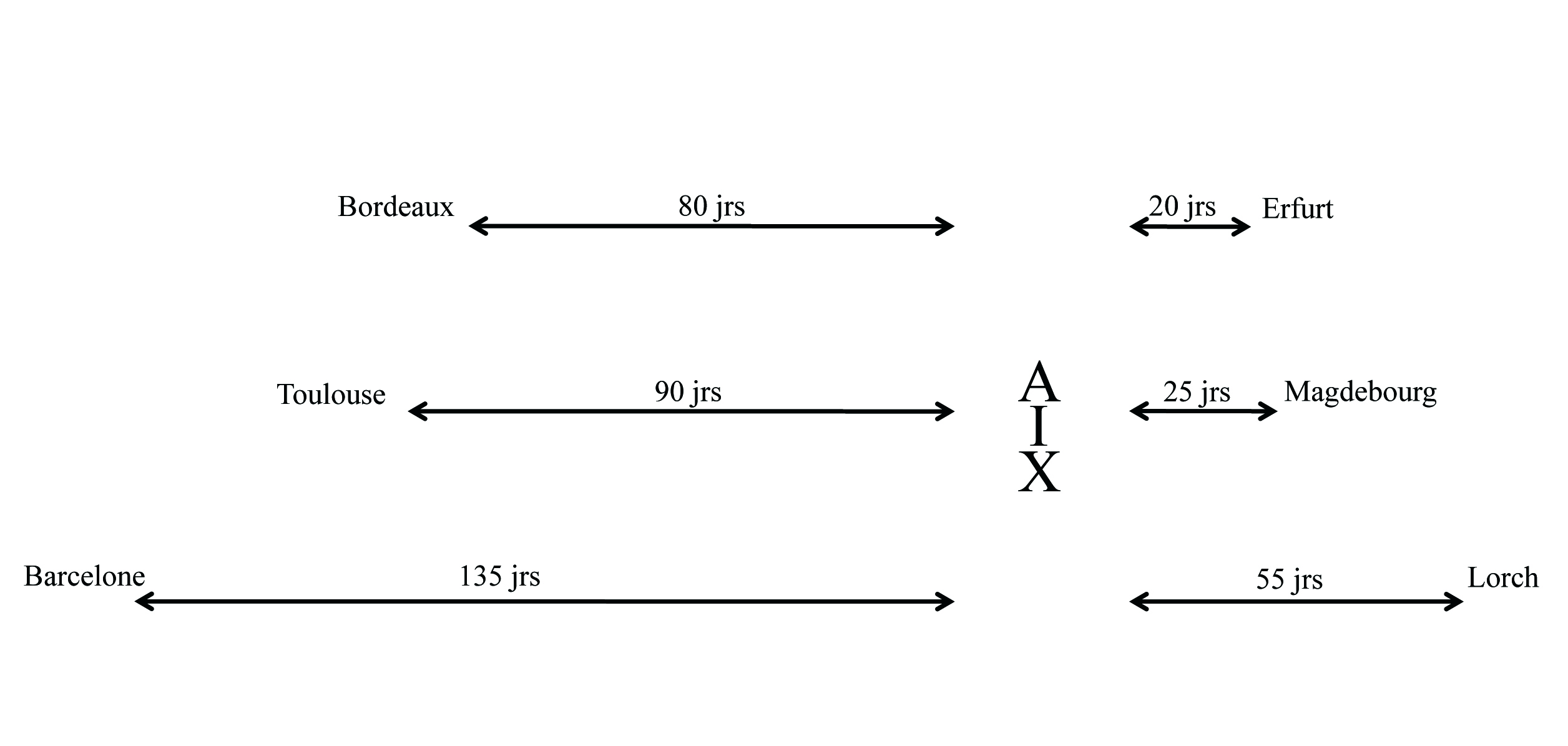 Il en retourne qu’un messager ordinaire dont la vitesse moyenne oscille entre 20 et 50 kilomètres par jour peut faire neuf fois l’aller-retour entre Aix et Paderborn, dans le temps requis pour aller et revenir une seule fois de Toulouse.