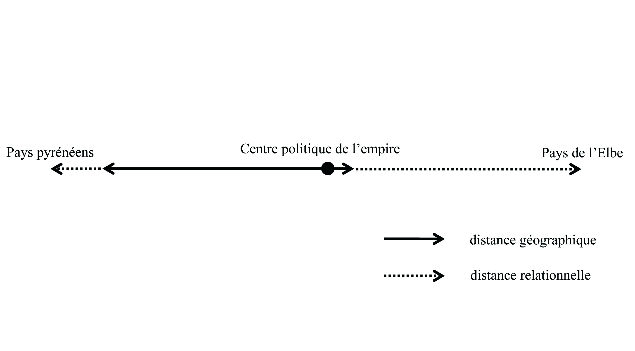 L’Empire carolingien n’est pas un État administratif moderne, mais bien un réseau de relations. Il en découle que la distance géographique joue un rôle plus important qu’on ne le considère généralement dans les rapports entre son centre politique et ses périphéries. Cette distance donne aux relations de l’empereur aux élites du royaume d’Aquitaine une tonalité de partialité et de réactivité qui s’apparente à celle des interactions avec les pays slaves, situés beaucoup plus près du cœur politique de l’empire, mais bien plus éloignés d’un point de vue relationnel.