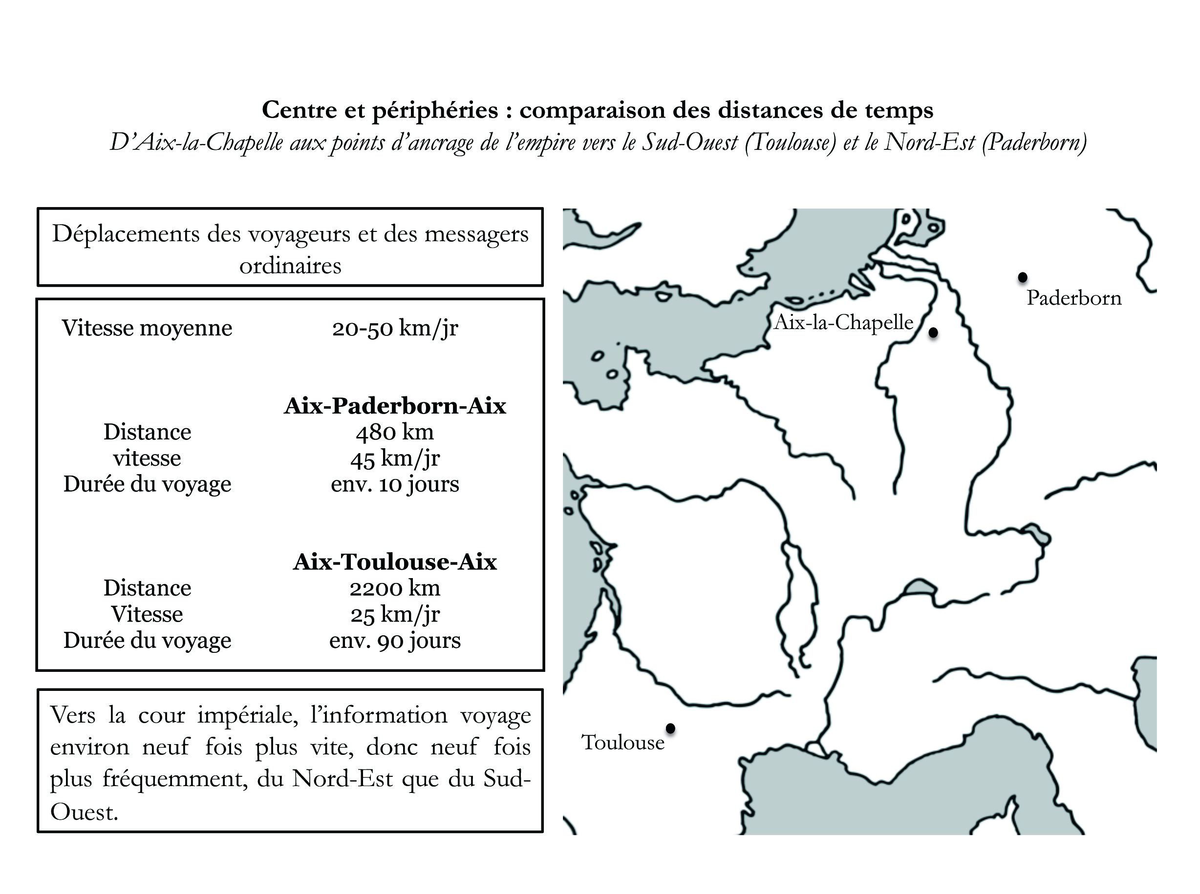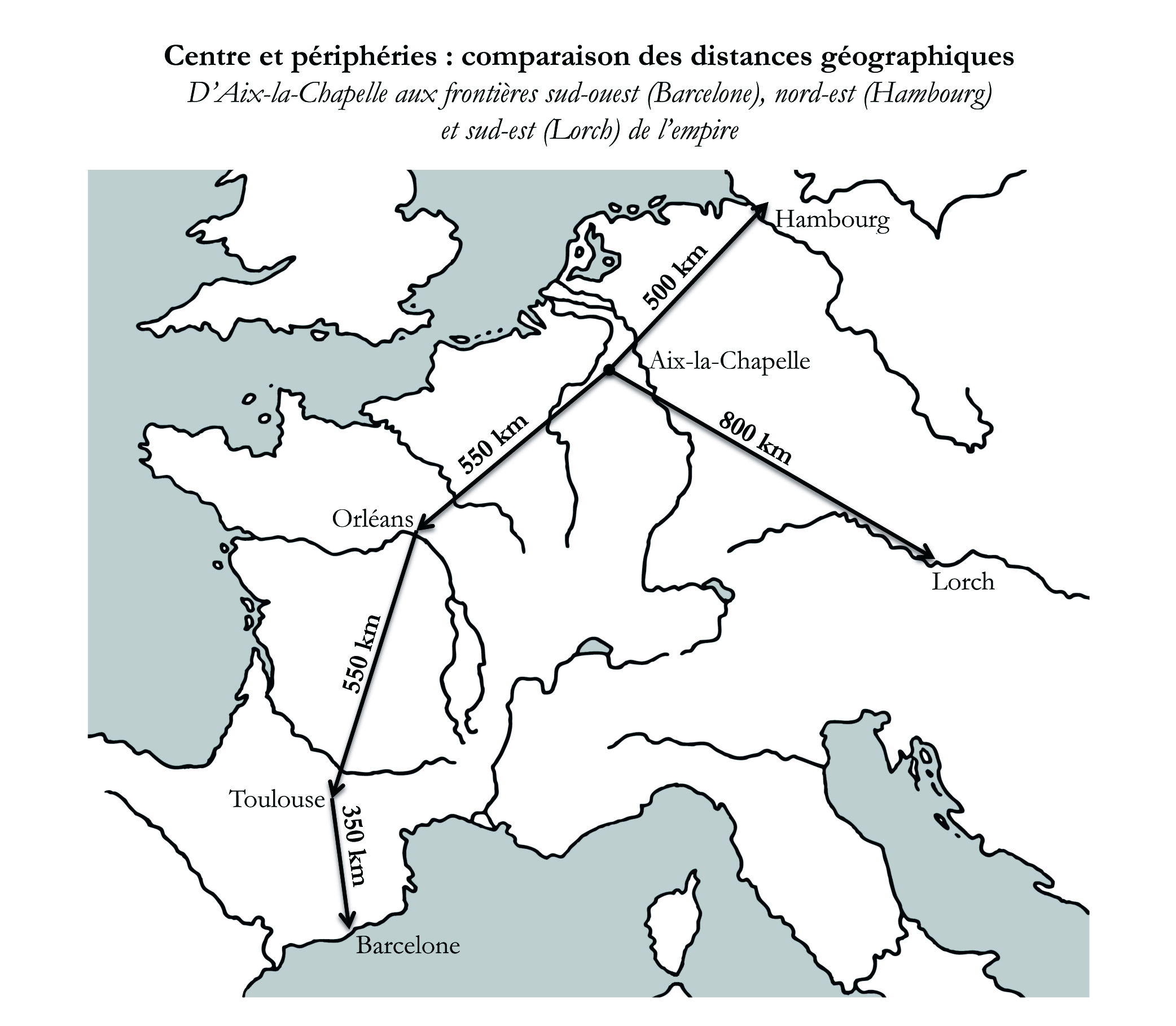 Aix est à environ 500 kilomètres de Hambourg et à 800 kilomètres du monastère bavarois de Lorch, aux portes du royaume morave. Dans l’autre direction, il faut parcourir 550 kilomètres pour rejoindre Orléans, encore 550 kilomètres pour Toulouse, et au moins 350 kilomètres de plus pour Barcelone. Ainsi, il faut près de 1 500 kilomètres pour gagner l’extrême limite sud-ouest de l’Empire carolingien, soit près du double de la distance à parcourir pour atteindre la marche de Dalmatie. La frontière de l’Èbre – dans la Péninsule hispanique – est trois fois plus éloignée que celle de l’Elbe – dans les pays slaves. En fait, cette proportion est encore plus importante, car il faut tenir compte de la réduction de la vitesse moyenne des voyageurs en fonction de la longueur de leur route [9].